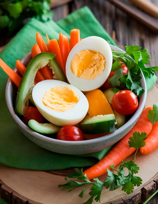 3. Ovos cozidos com tomatinhos, cenoura e pepino