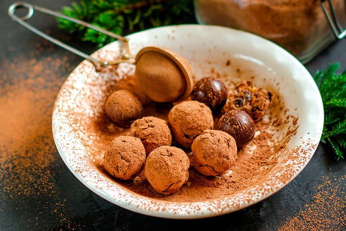 1. Com as mãos levemente untadas, molde bolinhas com aproximadamente 2 a 3 cm de diâmetro. Passe-as no cacau em pó para criar uma cobertura aveludada e leve.