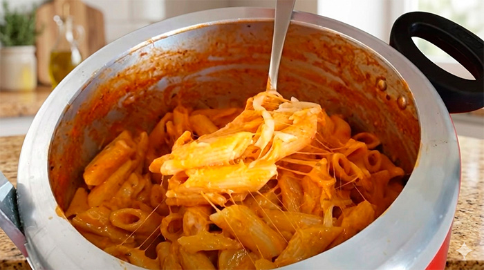 Aqui entra uma das queridinhas entre as receitas com panela de pressão. O macarrão de panela de pressão fica pronto rápido e é uma comida gostosa e fácil de fazer.