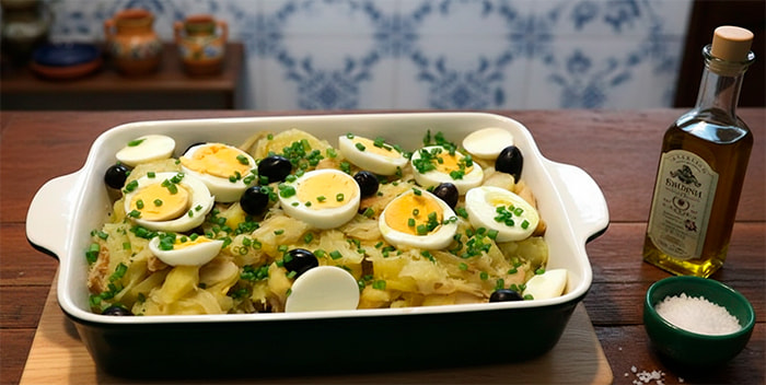 - Retire do forno, distribua os ovos cozidos em rodelas e finalize com azeitonas e salsinha.